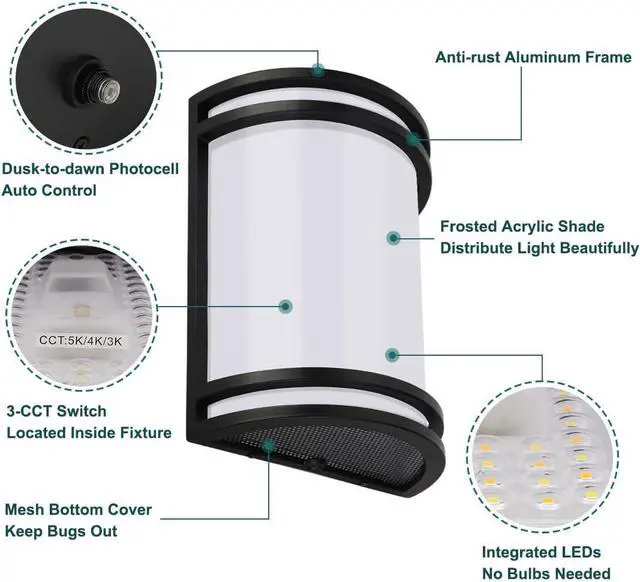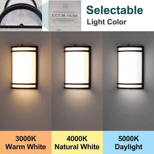 3 Light Colors in 1 This outdoor wall light has a built-in switch with 3 color temperature settings: 3000K warm white, 4000K bright white and 5000K cold white. Its easier to create the right atmosphere for a space with this feature.