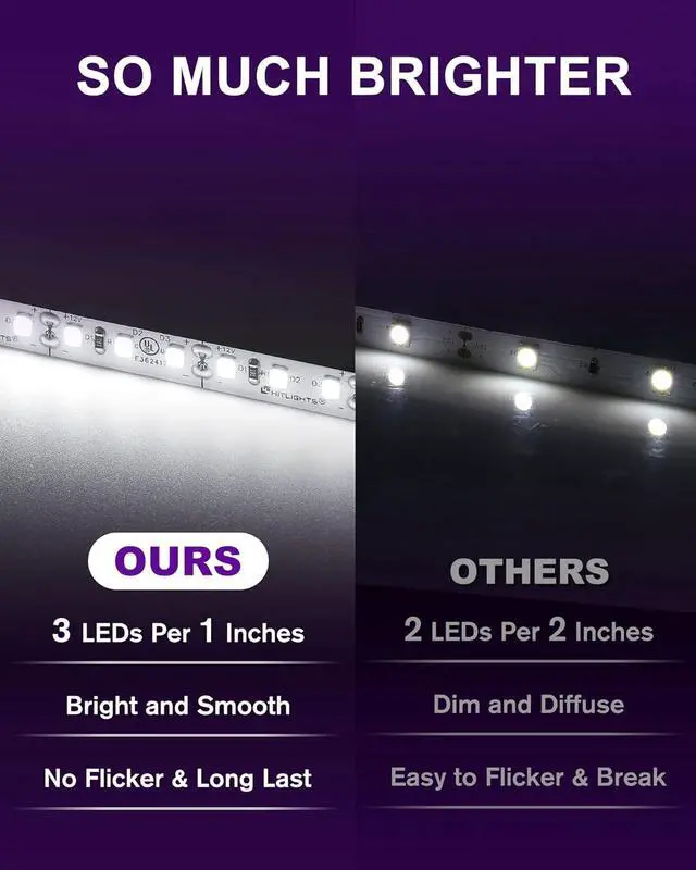 HIGH DENSITY LED STRIPS: Made of double sized PCB board (2835 chips) making strips more durable and reliable for long-term use. With a lifespan of over 60 000 hours. These discreet strips feature closely packed LEDs for smooth even light without any spotsDIMMABLE