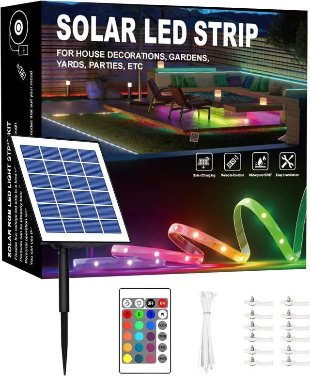 package includes: 50ft solar-powered RGB light strip (pre-installed batteries) mounting stakes and detailed instructions. Our premium outdoor waterproof LED strips come with a 12-month manufacturer and 24/7 customer support - because quality matters. Why Choose Our Solar Strip Lights?: Energy-efficient solar LED strip lights outdoor Sturable outdoor LED strip lights waterproof construction Convenient solar strip lights outdoor waterproof design Customizable waterproof LED light strips User-friendly LED light strips with remote control Brighten your nights ustainably with our high-performance RGB LED strip collection!