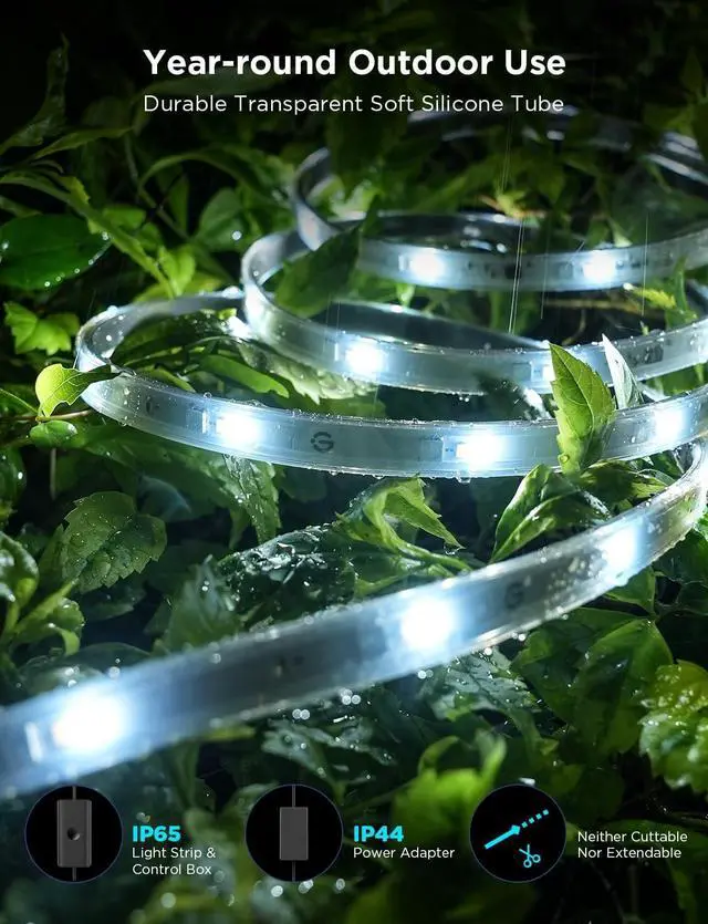 RGBIC Technology: Govee outdoor lights utilize independent control (IC) to show multiple colors simultaneously on one strip light. Experience endless color selection and festive scene modes for unique outdoor decor. (Neither cuttable nor extendable)