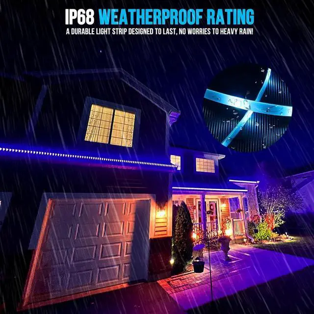 100FT outdoor led strip lights waterproof -- we design this outdoor lights into 1 roll of 100ft with perfect brightness unlike others that come in two 50ft or three 32ft sections and are difficult to install. Ideal led lights for bedroom or permanent outdoor christmas lights. IP68 WATERPROOF led light strips -- The RGB LED strip lights and control box are covered with a silicone coating making the entire strip lighting system waterproof. These rope lights are suitable for use outdoors on roofs gutters and pergolas 2.4G REMOTE + APP CONTROL -- The 2.4G remote and duoCo Stripapp allow for versatile control of the lights' color speed and rate of change from up to 100ft awayEASY TO INSTALL -- with super strong double sided tape this outdoor led strip lights are easy to install to outdoors and it creates an amazing atmosphere when sitting outside at night.
