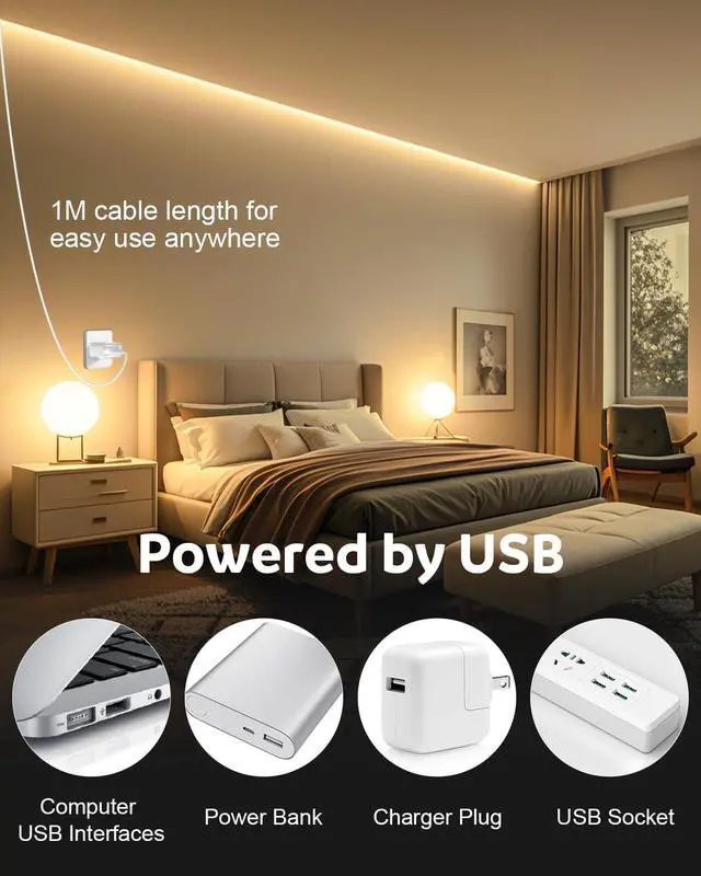USB COB Led Strip Lights: 3M 320leds/m DC5V 8W/M 3000K CRI>85 warm white super bright and high density. It is powered by USB and can be plugged directly into a USB socket or a charger block. The USB cable is 100 centimetre long enough length to make connections easily which is amazing! It is the first choice for modern lighting and home decorationEasy to install and use: There is a strong self-adhesive tape on the back of the LED strip. You can easily install it on the back of TV sets cabinets closets next to stairs etc. where lighting is needed. However please keep the surface clean and tidy before installation so that the adhesion performance will be better. The flexible FPCB led strip allows it to bend freely into the shape you want. Very perfect for home and DIY lighting decorationFlexible LED