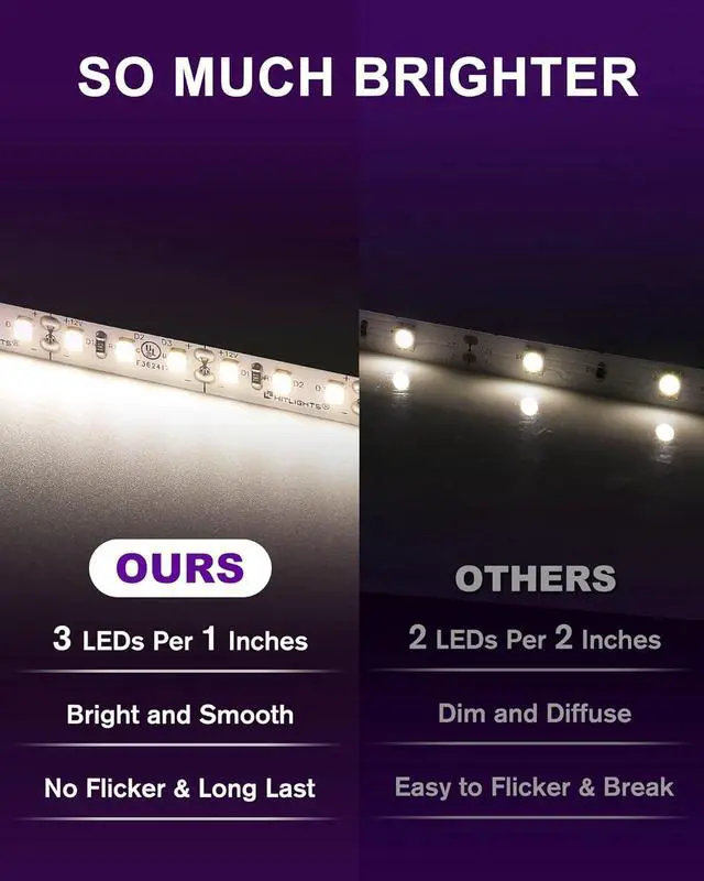 HIGH DENSITY LED STRIPS: Made of double sized PCB board (2835 chips) making strips more durable and reliable for long-term use. With a lifespan of over 60 000 hours. These discreet strips feature closely packed LEDs for smooth even light without any spotsDIMMABLE