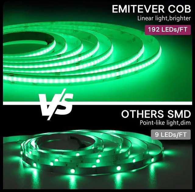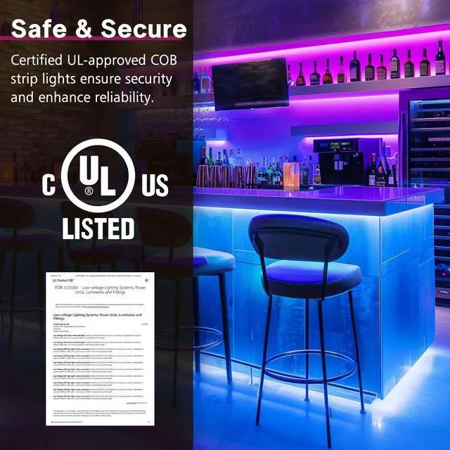 Our strip light equipped with 192 LEDs/ft the brightness of LED bars can be improved by 90% (Max) compared to another strip with less than 10 LEDs/ft. COB Strip light is the perfect solution for seamless accent lighting. Safety and Quality Control Enjoy peace of mind with our UL Listed strip lights and ETL power supply. Third-party tested for safety quality and energy efficiency meet strict standards for security and satisfaction. Ideal for various applications they offer reliability longevity and reduced energy costs. Easy to install Straight out of the box this versatile package includes everything you need to illuminate your space.