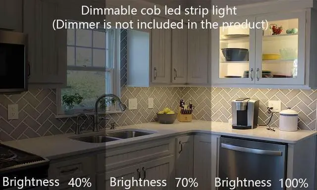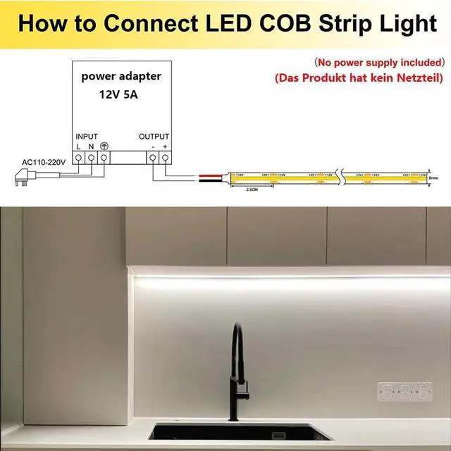 Uniform light emission The COB technology enables a much higher packing density of the LED array No dark spots Higher luminous efficacy Higher CRI (90+). The COB LED light strip emits uniformly and softly without ultraviolet rays and is comfortable and soft. (Without power supply) High brightness High-density 480LED/M 2400LED/5M COB LED strips can achieve a brightness of 4000lm Which is roughly equivalent to a 300W incandescent lamp and can meet most lighting needs. 12V Input The 12V voltage is a safe voltage and it is safe to touch and risk-free. Pre-soldered 2.1 x 5.5 mm DC female connector for easy connection to the power adapter (Without power supply) Easy to InstallThe LED light strip can be cut every 2.5 cm.