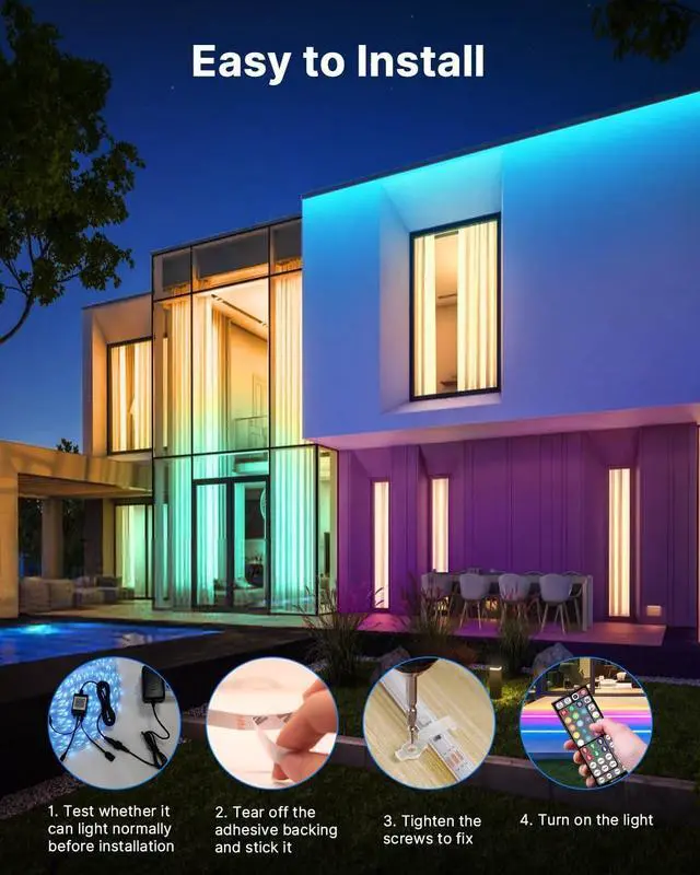 (Note: The primary purpose is for ambiance so its not bright enough for general illumination. )Easy Installation Outdoor RGB LED lights comes with adhesive backing for easy installation. However for long-term or wall-mounted use we recommend using the included screws to securely install it. The adhesive alone may not be strong enough for extended use due to the weight of the strip.