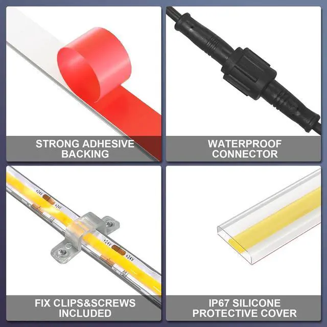 IP67 Waterproof for Indoor & Outdoor Use These IP67 Waterproof COB lights are built to withstand rain dust and humidity ideal for gardens patios kitchens and bathrooms. Perfect for weddings Christmas decorations bars or under-cabinet lighting. These IP67 Waterproof COB lights adapt to any scene! 100Ft Extra Long COB LED Lighting --- These warm white 3000K COB LED strip lights for outdoor 100ft (2 rolls of 40ft) are long enough to decorate and lighting larger areas giving you more coverage and more design options. You can use these COB LED strip lights as supplementary lighting in dark areas to enhance the sense of hierarchy in your space.