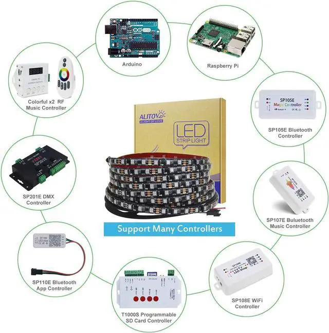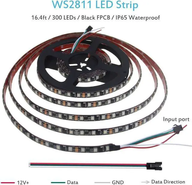 WS2811 Addressable LED Strip5M long with 300 pcs 5050 RGB LEDs and 100 pcs WS2811 IC which are organized in groups of 3 LEDs with 1 IC. Each group can be controlled individually. It will display much more amazing Static and dynamic color effects than regular RGB strip lights. Support Many ControllersIt is compatible with Arduino Raspberry Pi T1000S K1000C etc programmable controllers. Support SP105E SP108E SP110E app controllers SP106E SP107E music controllers SP501E and MHCTRWF5V smart WiFi Controllers. app controllers SP106E SP107E music controllers SP501E and MHCTRWF5V smart WiFi Controllers. (Controller is not included) User-friendly DesignDesigned with 3pin JST-SM connectors on both ends for hooking up.