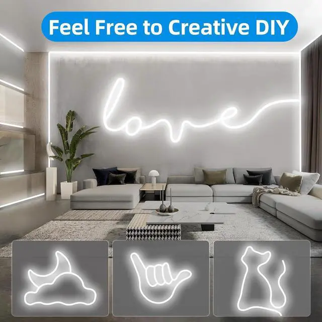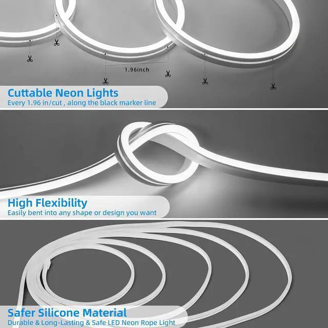 High CRI LED Neon Rope Light Upgraded LED and Side-Brightness Design Make Led Strip Lights Shine Brighter than others 120 Degrees Projection Range offers Large Illumination Coverage and the Light is very even down the Strip. Neon Lights with Dimmable Controller Unique Design LED strip light come with Upgrade Dimmable Controller Slide clockwise dimmer to adjust light brightness (dim to bright). You could adjust 0%-100% Level of Brightness as you like which is very easy to operate. Easy to install and DIY Design Led Neon Strip Lights are very flexible and can be easily bent into any shape or design you want.