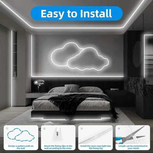 ELOUYCKE Neon Flexible Strip Light can be fastened with snaps for easy installation. Just hold the neon strip in place and connect the power supply. Notices 1. Neon strip light without Back self-adhesive only fixed clip installation(Product included 30* mounting clips and 30*snap; 2. Without APP/ Remote Control; 3. Please cut along the black marking line on the strip 1.96 in/Cut; 4. To avoid poor heat dissipation please don't light up the neon light strip in a roll; 5. Keep the connections and end tail side indoors or in waterproof boxes when using outdoors; 6.
