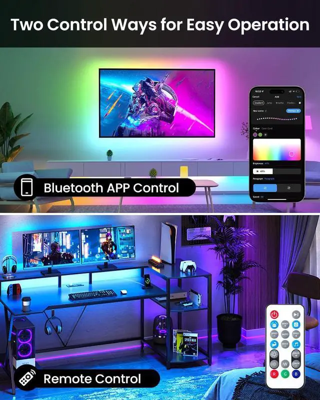 Scenes & Music Sync Mode]: Designed with 44 preset scene modes the LED string lights could create a stunning background with dynamic lighting for intimate get-togethers or lively parties; The strip light is built-in with a high-sensitivity mic in the control box for syncing to the sounds and music and producing gorgeous light effects to your music party; The color and brightness of the lights will jump with the rhythm and volume of the music[Easy