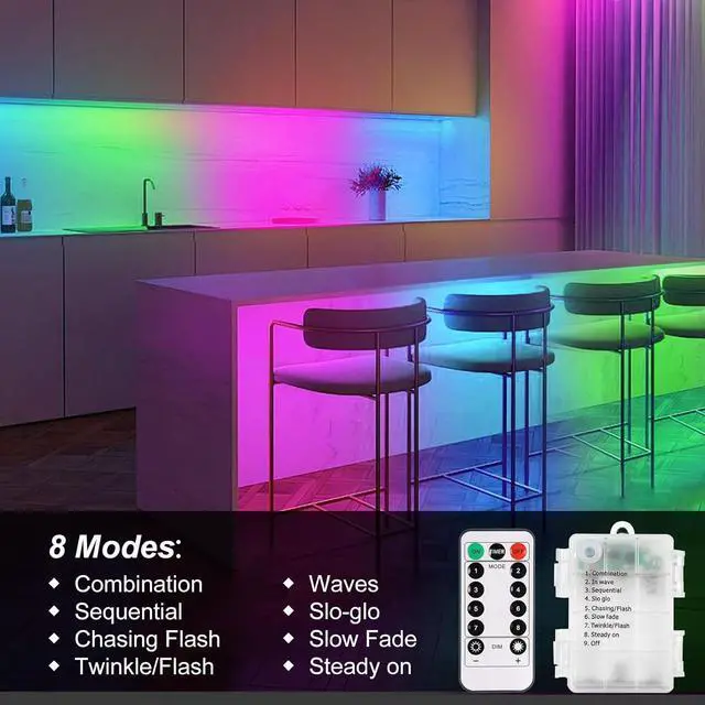 Convenient Cuttable & Safe: The 3m LED Strip Lights can be cut every 3 leds along the cutting marks without damaging the rest strips also create a lot of different shapes according to you need. And easy to install and use safe to use the working voltage is 3V low heat. Please note that the cut off part will no longer work only the part connected to the power supply can continue to be used. 8 lighting modes &