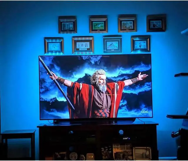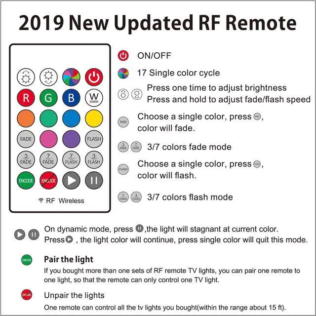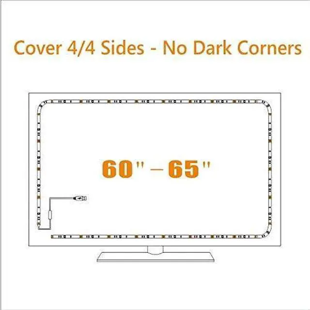 Custom Version TV Backlight can cover every(4/4) sides of 60 to 65 inch TVTV light for better TV viewing or video games experience and Relieve Eye Strain. Help to make a more comfortable environment when long watch watching and playing TV gamesPowered by USB of your TV it will ON/OFF with your TVLED strips itself is black no noticeable; Easy to install take 5 to 10 minutesWireless RF Remote 360 degree and 60ft MAX. control range 17 colors (include white) with fade/flash modeRemote with Encode mode remote can control two more TV lights or one remote to only one remote