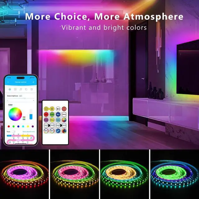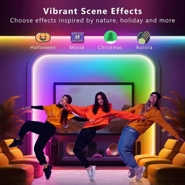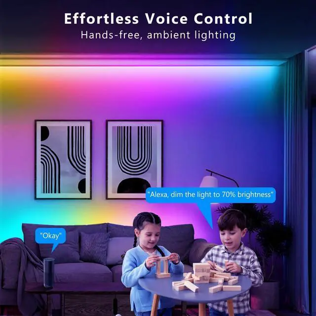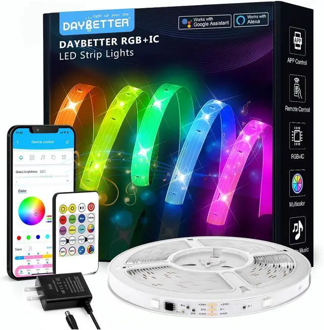 Smart effects: Led strip lights for bedroom display multiple colors on one line at a time compared with traditional rgb lights. Smart led lights designed for holiday create a colorful lighting feast to your festival decorations and party decorVoice control: The smart led light strip is no longer needs to be controlled by hand. It works with Alexa echo and Google assistant you can control the functions of this led strip lights through voiceWireless smart app: The Daybetter app offers you advanced control over your led strip lights and access to incredible features like the customizable diy mode and a convenient timer functionMusic sync mode: Make your smart led strip lighting for festival decor dance for an immersive home concert experience the integrated high-sensitivity mic will effortlessly sync with your favorite audioEasy installation: Install your led strip lighting conveniently and with more creative freedom thanks to the adhesive. Attach the Daybetter WiFi led lighting strip to any dry clean indoor surface with ease (Note: The led strips are not waterproof)
