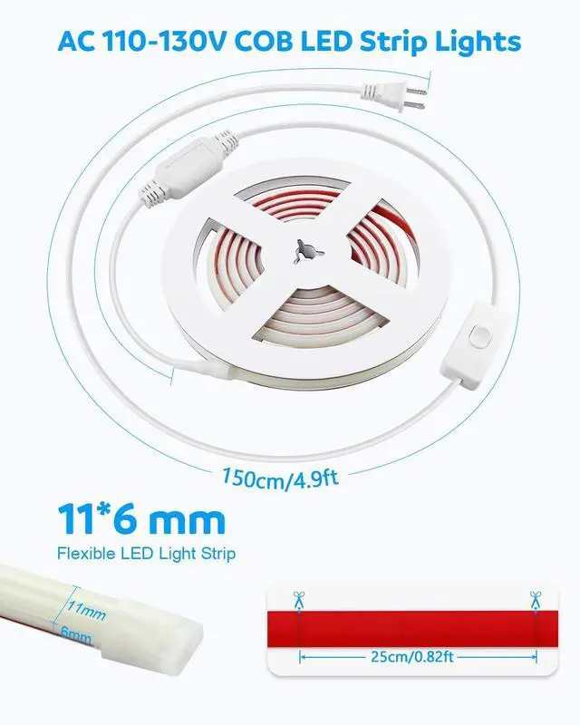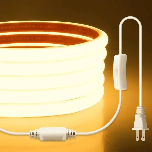 Super Bright COB LED Strip: 6.56FT /2M led rope lights indoor warm white enjoy consistent 3000K warm white illumination with our high-density COB LED strip (288 LEDs/m) delivering 800LM/m brightness with no visible spots flickering or voltage drop. Features a 180° beam angle for wide coverage and CRI90+ for true color rendering. Great for home modern lighting projects and outdoor lighting decorationEasy to install: Includes a 1.5M cord with plug switch and rectifier (plug-and-play) no voltage drop and no flickering there is no difference in brightness between the first and the end of the 110v cob led strip to ensure the visual experience when using the manual switch button is easy and convenient to operate. In addition Red adhesive backing + 5 clips/screws enable secure mounting on walls sheds or furnitureno extra tools needed.