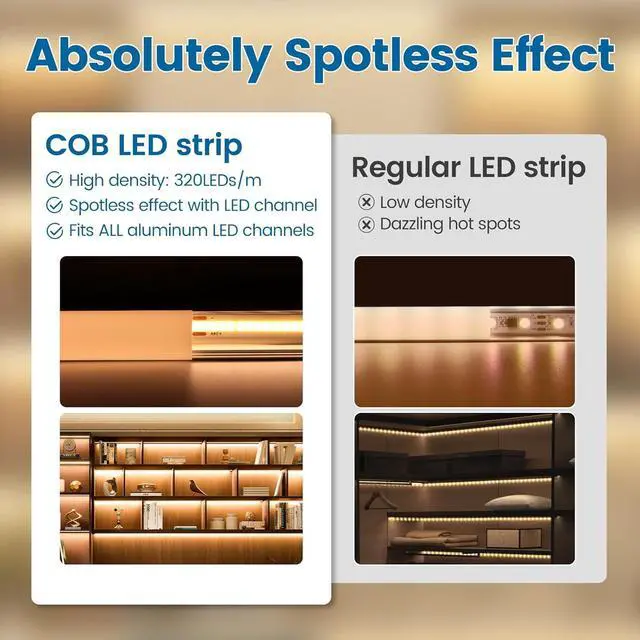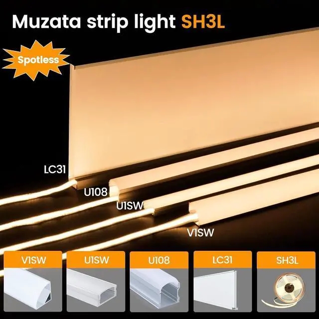 Spotless Illumination: Say goodbay to dazzling LED dots. When paired with Muzata aluminum channels the Muzata SH3L COB LED strip light effectively eliminates hotspots delivering evenly distributed and softly diffused light with Muzata LED channel can achieve a better spotless effect if you want to buy the LED channel please search for the Asin after the model number purchaseUltra