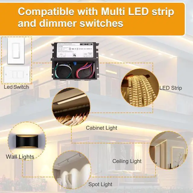 Driver compatible with: Triac / 0-10V / 1-10V / 10V PWM / Potentiometer dimming. Seamless dimming with many household switch: TRIAC (forward phase) MLV ELV and Multi major brands. Ideal for 24V