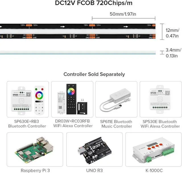 Stunning Lighting EffectsAmazing Mixed color producing multi fantasy colors. 3 colors RGB can be mixed into 16 million different colors. Built-in addressable WS2811 IC chip matching with the correct controller not only can you adjust various static colors but also achieve diverse dynamic lighting effects such as: colorful curtain-up/ flow water/raindrop/jump flash and so on. (Controllers Sold Separately) Cuttable and Re-attachableBTF-LIGHTING COB LED strip is soft and flexible. The interval between the two Cut Mark measures 1.96 in (50mm). 3PIN connector on two ends one is female the other one is male. It also support end to end connect in series. 12mm width. Shopping With ConfidenceAdopting real double-layer copper PCB board better electronic conductivity and heat dissipation. More than 65 000 hours lifespan. We also provide 12 months worry-free warranty and 24/7 customer service. Wide ApplicationOur FCOB LED light is perfect for various interior decoration. Such as living room hallway bedroom kitchen accent lighting cabinet lighting stair mirror corridor DIY backlight DIY lighting special use and other commercial and residential lighting projects. Come with a strong self adhesive backing.