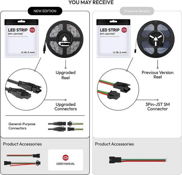 Tips: Before installation please thoroughly clean and dry the installation surface. Packing listPower supply or controller is not included. 1XLED Strip 1X3PIN Male Connector 3x Fixed Clips.