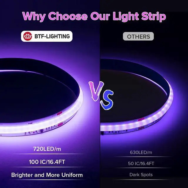 Group of LED AddressableDC12V 16.4FT 720LED/m 20IC/m one WS2811 IC Chip drives 36 LED. Total 100 WS2811 IC Chip. The more beads the brighter the light. With 720 dense light-emitting units each meter the light is brighter and more uniform than 630LED/m COB WS2811 RGB LED strip. Black PCB. Ultra Bright and Uniform Flip Chip On Board LED strip (FCOB). Adopting high brightness LED as the light source to ensure the brightness while maintaining color consistency. Compared with traditional 5050SMD RGB/3528SMD RGB LED strips FCOB light strips dense light-emitting units create a brighter softer more dream color and uniform light avoiding Black in the middle area.