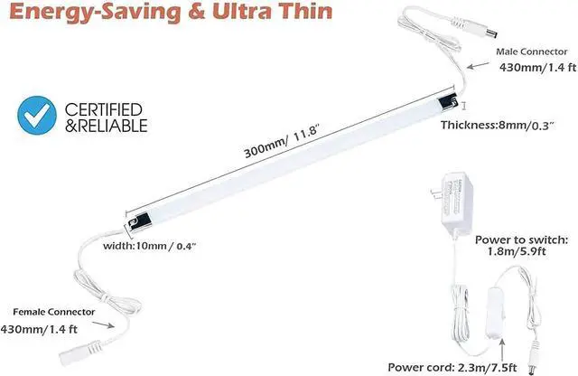 ???????????????????????????????????????: Experience the cozy glow of our LED Strip Lights Kit featuring 6 x 12-inch bars a rocker switch and a UL-listed A/C power adapter. Each bar consumes only 1.5 Watts with 15 high-intensity SMDs producing a radiant 150 lumens.??????????????????? &??????????????: Our Light Bar Set boasts over 90% energy savings compared to halogen lamps. Perfect for permanent installations offering long-lasting consistent lighting without the hassle of battery replacements.?????????????????????????????????????????????: Install each bar separately or connect multiple for extended coverage. Ideal for large cabinets or countertops additional bars can be easily added to customize your lighting needs.????????? -??????????????????????: Utilizing advanced run cold technology our slim LED bars operate at a safe DC12V ensuring they remain cool to the touch and offer an extended lifespan with minimal light decay.?????????????????????????????????????????: Equipped with adhesive tape and screws setup is quick and effortless. Transform your spaces with this budget-friendly and energy-efficient light kit backed by a 50 000-hour lifespan and a 3-year warranty.