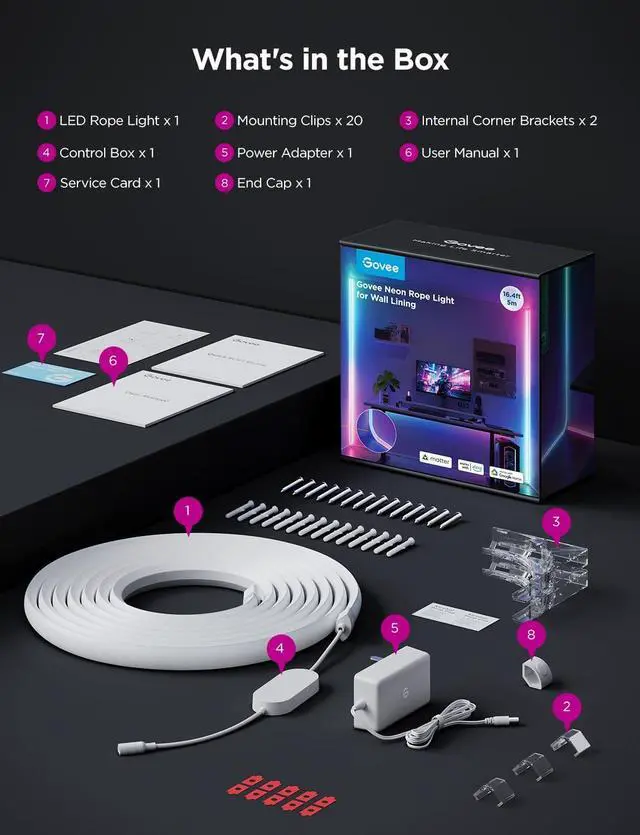 Flawless Corner Adaptation: Govee led rope lights can easily fit the corners of any room with a cleverly-crafted right-angle structure for seamlessly blending with the wall. Can be installed on vertical corners wall edges skirtings.