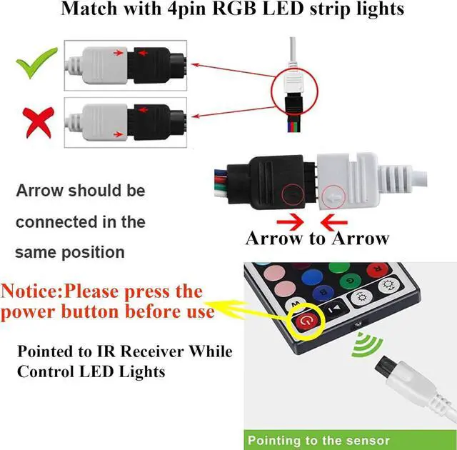 Kindly Reminder: First pull out the plastic cover on the buttom of remote before use. Second connect box output port with led strip (arrows marks between control box and strip connector should be on same position). Third remote should be aimed at the ir receiver and without any obstacles. Fourth indoor use only keep away from waterPacking: 1 x 24 key ir remote controller 1 x rectifier control box 1 x 12 V 3 A power supply connector 1 x 4 pin male to male connector can be pulled out if you don't need it