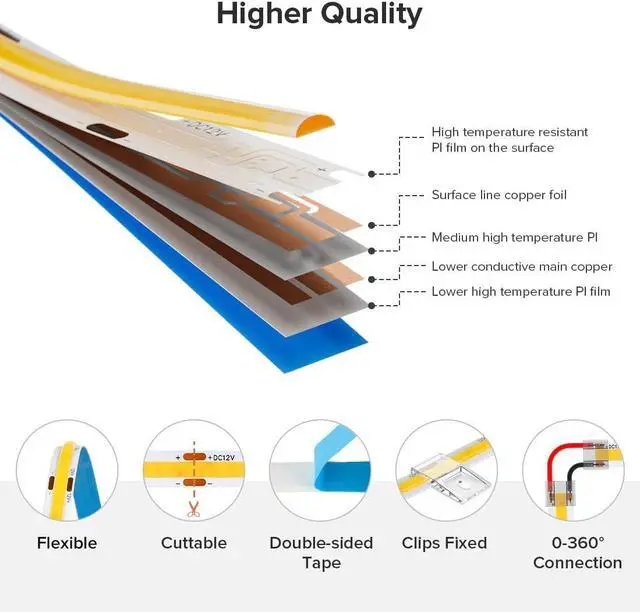 Ultra Bright DC12V 320LEDs/m 8mm 3000K Warm white FCOB LED strip light. Compared with traditional 5050SMD 3528SMD strips the dense light-emitting units of COB strips create brighter softer and more uniform light avoiding blackness in the middle area. 180-degree light-emitting angle wider illumination range and provide uniform linear illumination. High Quality The double-layer pure copper printed circuit board design provides excellent stability for the COB LED tape and also significantly improves the heat dissipation of the light bar. Safer for children and pets. It is environmentally friendly and contains no infrared radiation mercury lead or other heavy metals.