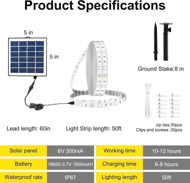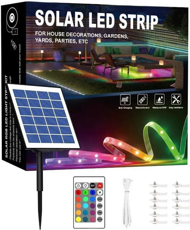 package includes: 50ft solar-powered RGB light strip (pre-installed batteries) mounting stakes and detailed instructions. Our premium outdoor waterproof LED strips come with a 12-month manufacturer and 24/7 customer support - because quality matters. Why Choose Our Solar Strip Lights?: Energy-efficient solar LED strip lights outdoor Sturable outdoor LED strip lights waterproof construction Convenient solar strip lights outdoor waterproof design Customizable waterproof LED light strips User-friendly LED light strips with remote control Brighten your nights ustainably with our high-performance RGB LED strip collection!