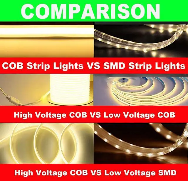 SUPER BRIGHT HIGH LUMEN COB LIGHTS STRIP: Upgraded Flexible COB LED Lights AC110V-130V. Be compare with traditional SMD LED strip lights this COB LED strip lights is 240 LEDs/m totally 1200 leds the density of the LEDs is more greater balance and no dark dots between continuous. High quality and energy efficient LEDs generate 30000 Lumens per roll super bright lighting CRI 90+HIGH