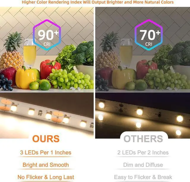 To Install: All led tape light comes with peel-and-stick 3M adhesive backing for a long lasting permanent hold. Wipe the surface with alcohol or water before use then remove the paper towel stuck on the LED strip to paste. The strip light is easy to cut. It cuts every 3 LEDs along the cutting mark. The cable has JST male connector. It is very convenient to DIY design. LED strip lights are flexible that pretty suitable for indoor lighting and decoration. LED lights for bedroom living room kitchen under cabinet dining room TV background mirror party stairway wedding bar etc. The color rendering index reaches 90 which is very close to the effect of natural light can better protect the eyes.