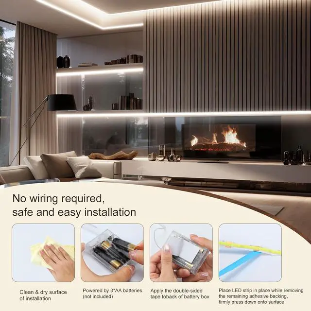 Convenient Battery Operation: The battery powered LED strip lights require no outlets or wiring; With strong adhesive simply peel and stick the strip onto drywall wood metal or plastic surfaces; Ideal for quick cordless lighting solutions in any roomHigh