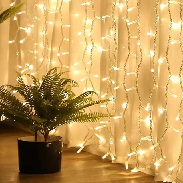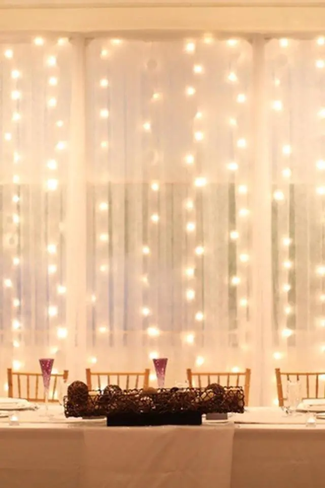 Create a soft, romantic glow with 600 LED twinkling curtain lights that resemble shining stars through sheer curtains.