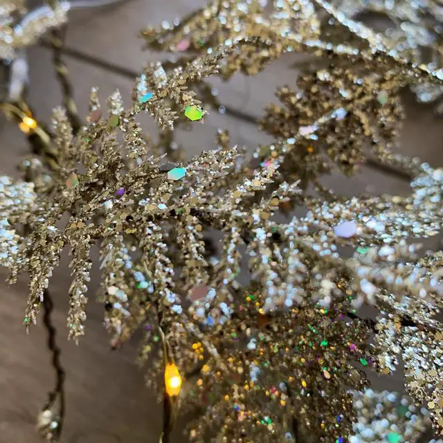 Illuminate your space with the GleamGlow 20 LED Gold Iridescent Fern Fairy Light. Featuring 20 warm white LEDs on a 7 battery-operated cord, this decorative light adds a magical, shimmering glow to any room or event. Easy to use with an on/off switch and compact tri-tip fern design, its perfect for table displays, shelves, or festive décor. Requires 3 AA batteries (not included).