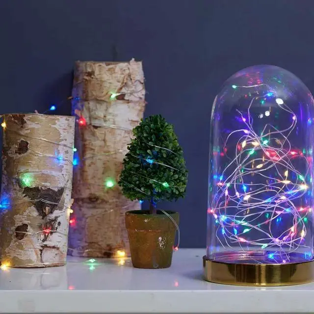 Delicate and sparkling, these 20 LED Mini Fairy String Lights bring luminous charm to any space. Available in 3 color options, they allow you to create a custom lighting experience. Made from flexible silver copper wire, they can be wrapped around macrame wall hangings, draped over plants, or added to walls for a magical glow. Battery powered and ready to use straight out of the box.