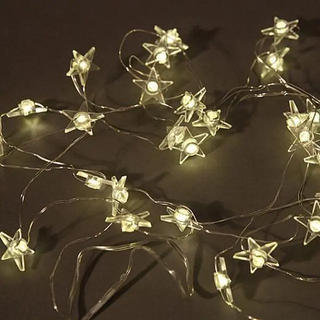 A set of 20 LED string lights with star-shaped bulbs in warm white. Battery operated and perfect for adding a cozy touch to any indoor décor.