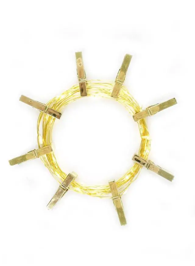 Add sparkle to your space with these 36 LED gold photo clip string lights. Metallic gold clips reflect light while warm white LEDs provide a soft glow. Perfect for hanging photos, postcards, or artwork on walls, desks, or headboards.
