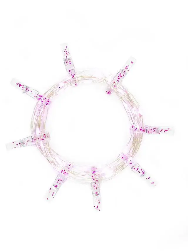 Add a playful and colorful touch with these 36 LED pink glitter photo clip string lights. Pink glitter clips reflect light while pink LEDs provide a soft glow. Perfect for hanging photos, postcards, or artwork on walls, desks, or headboards.
