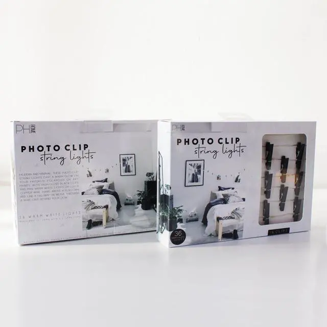 Display photos, postcards, or artwork with these 36 LED matte black photo clip string lights. Pink glitter clips add sparkle while warm white LEDs provide a soft glow. Battery operated and portable, perfect for walls, desks, or headboards.