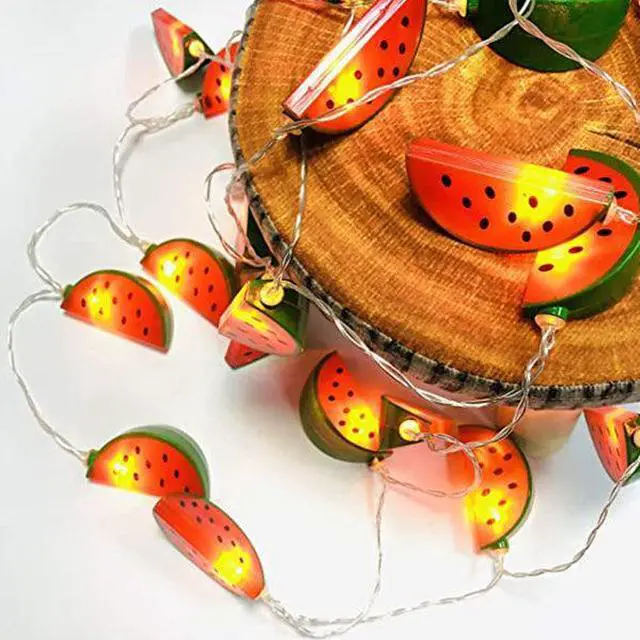 Add a fun and fruity touch with these 10 LED warm white watermelon string lights. Battery operated and versatile, perfect for decorating windows, trees, decks, or other indoor spaces.