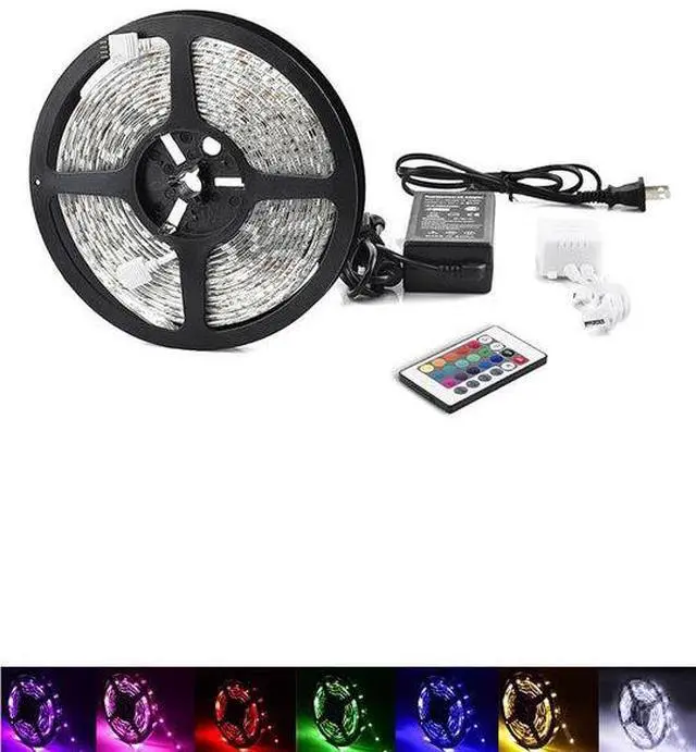Slim, self-adhesive, and flexible, these 300 LED 5050 RGB strip lights provide vibrant illumination for indoor and outdoor spaces. Waterproof and safe to touch, they can be mounted, wrapped, or cut every 3 LEDs to fit your décor needs. Comes with all basic accessories including remote control and AC/DC adapter.