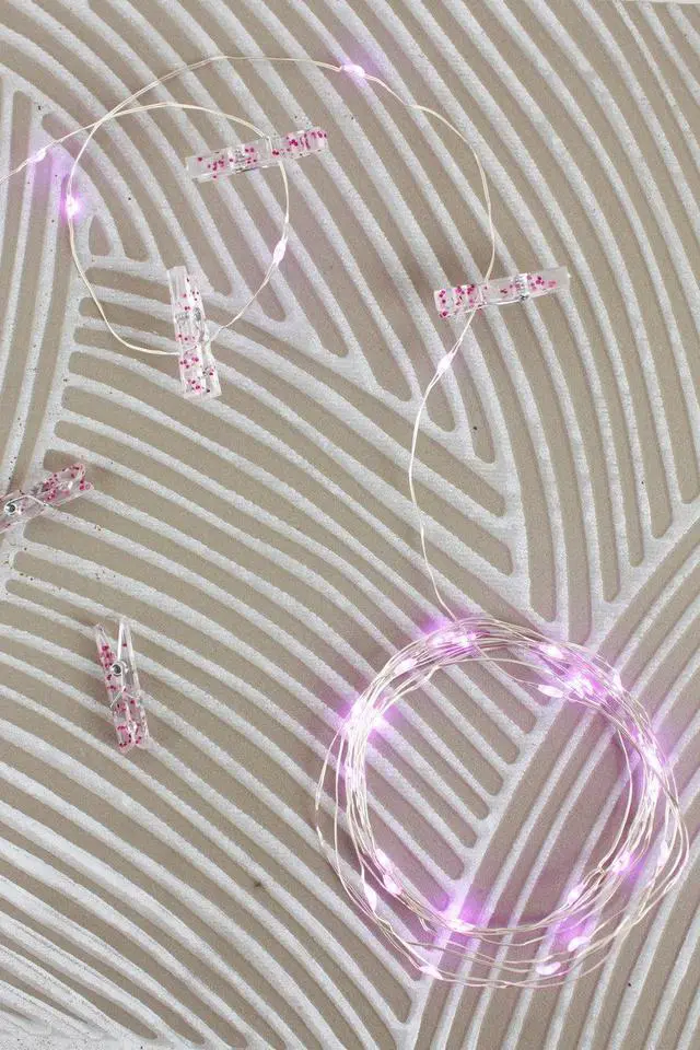 Add a playful and colorful touch with these 36 LED pink glitter photo clip string lights. Each clip features reflective glitter, and the pink LEDs provide a warm, cheerful glow. Perfect for hanging pictures, postcards, or artwork, these lights can be arranged on walls, above desks, or headboards for a personalized display.
