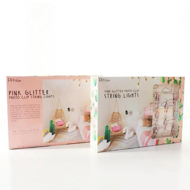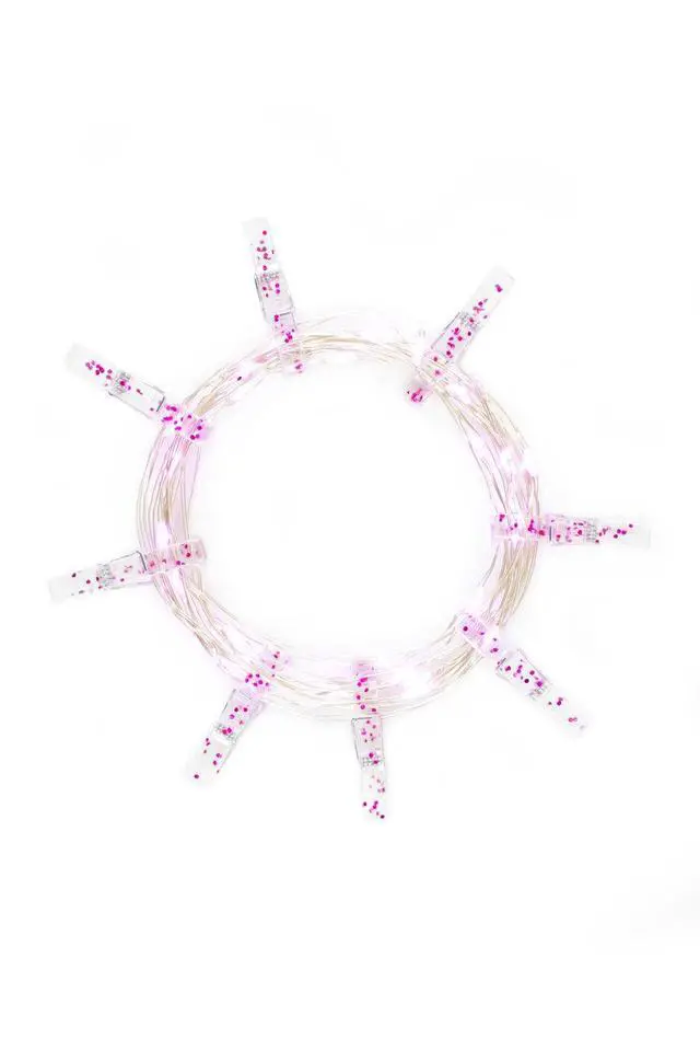 Add a playful and colorful touch with these 36 LED pink glitter photo clip string lights. Each clip features reflective glitter, while the pink LEDs provide a cheerful glow. Perfect for hanging pictures, postcards, or artwork, these lights can be arranged on walls, above desks, or headboards for a personalized and festive display.