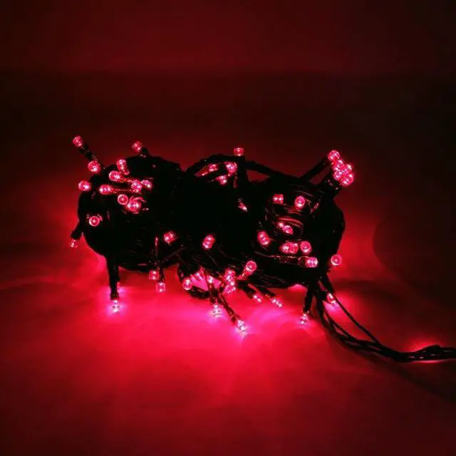 Add a festive twist to your décor with these 100 LED red string lights on green wire. High-quality wide-angle LED bulbs provide a bright, ambient glow while consuming up to 70% less power than traditional incandescent lights. Flexible green wires make it easy to wrap, drape, or decorate any space. Connector-ready design allows multiple strands to link together for extended displays. Ideal for indoor and dry outdoor use, perfect for weddings, parties, holidays, or everyday ambiance.