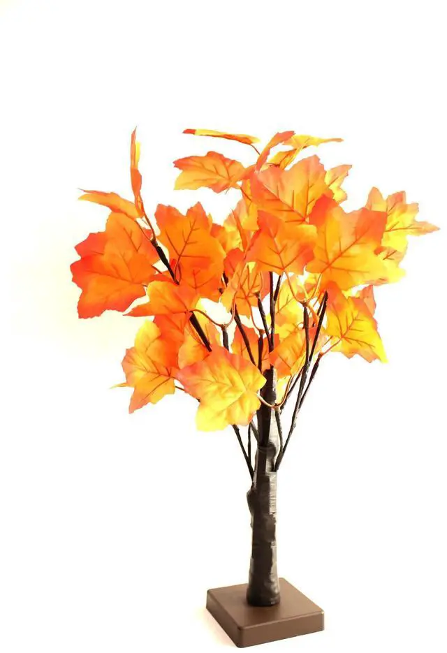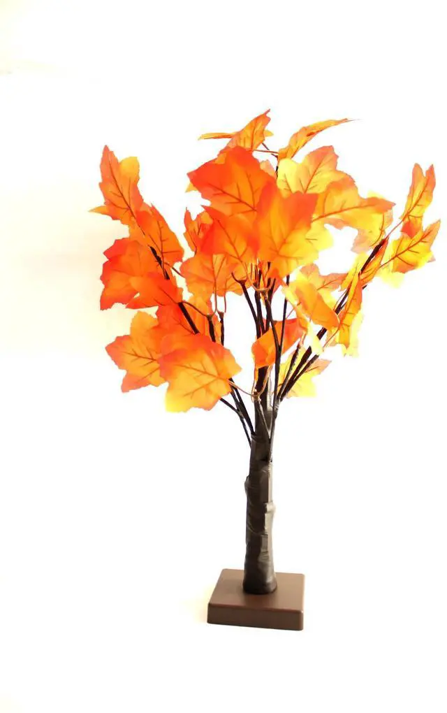 Bring the warm colors of autumn indoors with these 24 LED fall maple leaf tree lights. Each 20-inch tree is adorned with charming maple leaves and warm white LEDs, creating a cozy seasonal ambiance. Battery operated for convenient placement anywhere, these decorative trees are perfect for home décor, offices, or seasonal displays.