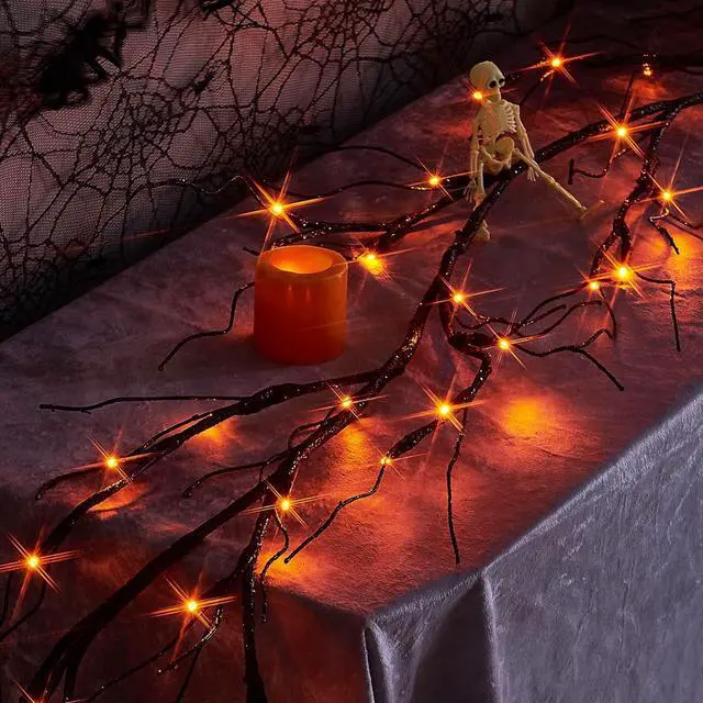Create a spooky and festive atmosphere with these 48 LED black branches garland lights. Featuring vibrant purple and orange LEDs, they are perfect for Halloween, autumn décor, or themed parties. The flexible black branch design allows easy placement on mantels, shelves, tables, or windows, adding a fun and eerie glow to any setting.