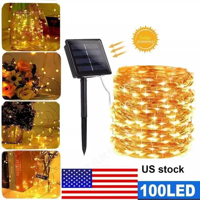 solar string lights: each set is 33 feet with 100 bright led bulbs. Led string lights produce a warm white soft glow which lend a festive touch to varied areas such as lamp box, porch, garden, yard, patio, balcony and more
