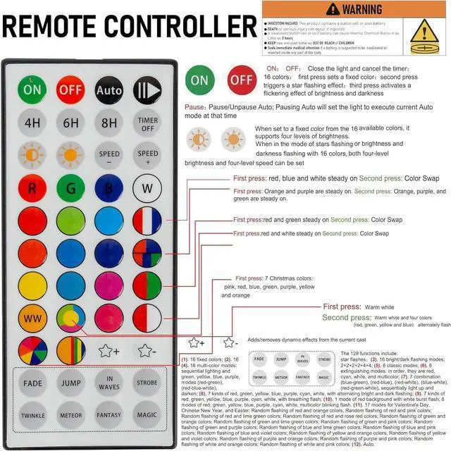 Control Modes: 1. When using the Bluetooth app you can enjoy features like group control DIY customization scene settings music synchronization microphone mode timers display collections and looping playback. 2. With the 44-Key remote you can easily adjust brightness speed set timers and switch lighting modes effortlessly. Multiple Christmas light strings can be added to the same group for integrated control; however the strings light cannot be connected end to end.