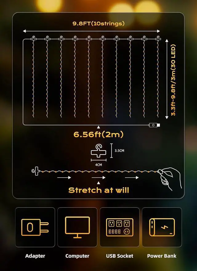 NOT included) (Hook size: 3.5 cm×4cm) 300 individual LEDs 9.8 ft x 9.8 ft Led Curtain Lights made of copper wire soft texture can be cut freely without affecting the rest so you can DIY any decoration you like. Copper wire drop strings is tough and flexible hanging and adjustable desired height naturally easily; No limits to your imagination Do the shape you like; Enjoy a fairytale world[8 Mode Remote Control Twinkle Lights] String lights have 8 lighting modes: Combination in waves sequential slogs chasing slow fade twinkle steady on. With a memory function the mode that is turned on again after being turned off is that before turning off. USB powered which can be used by plugging it into the computer power bank or USB interface[Timer & Remote] We can use the remote control to timing for 6 hours on and 18 hours off. What's more the brightness of our curtain lights is adjustable of 20% 40% 60% 80% 100%[Waterproof Strong and Bendable] Hanging Lights are IP44 waterproof (Please note that the USB interface is not waterproof please keep it dry when using it somewhere wet or raining); and the Christmas Window Lights are made of soft bendable silver wire which gives more creativity to bending it to any shape or wrapped it on anything! [Safety & Decoration] Operated with 5V low voltage our fairy curtain lights glow with low heating and it is safe to touch; hanging lights can be safely hung on the curtains or on the wall. It is a wonderful decor for dorm college bedroom party birthday wedding Christmas New Year indoor outdoor classroom room dorm ornaments