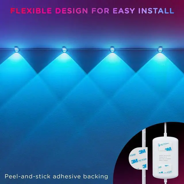 Lighting Meets Lifestyle Perfect for home theaters game rooms bedrooms hallways and more; a multitude of color combinations dynamic modes customizable effects; highest quality RGBWIC LEDs for true-color illumination with full rich colorsAll-in-One Light Strand One 8ft. USB-powered light strand with six LED light pucks and a 10ft. lead wire to ensure reach to a 5V 1A minimum USB-A port or wall adapter (not included); 18ft. total lengthSimple Lighting Controls Use the included IR remote control or the in-line controller; remote requires one CR2025 battery (sold separately) Easy Install Each light puck features 3M peel-and-stick adhesive backing for easy mounting; durable white cord fits perfectly against flat surfaces and 90-degree corners to blend with your decorMake a Difference 50% of net profits from your Enbrighten purchase are donated to causes providing food water shelter and disaster relief around the world